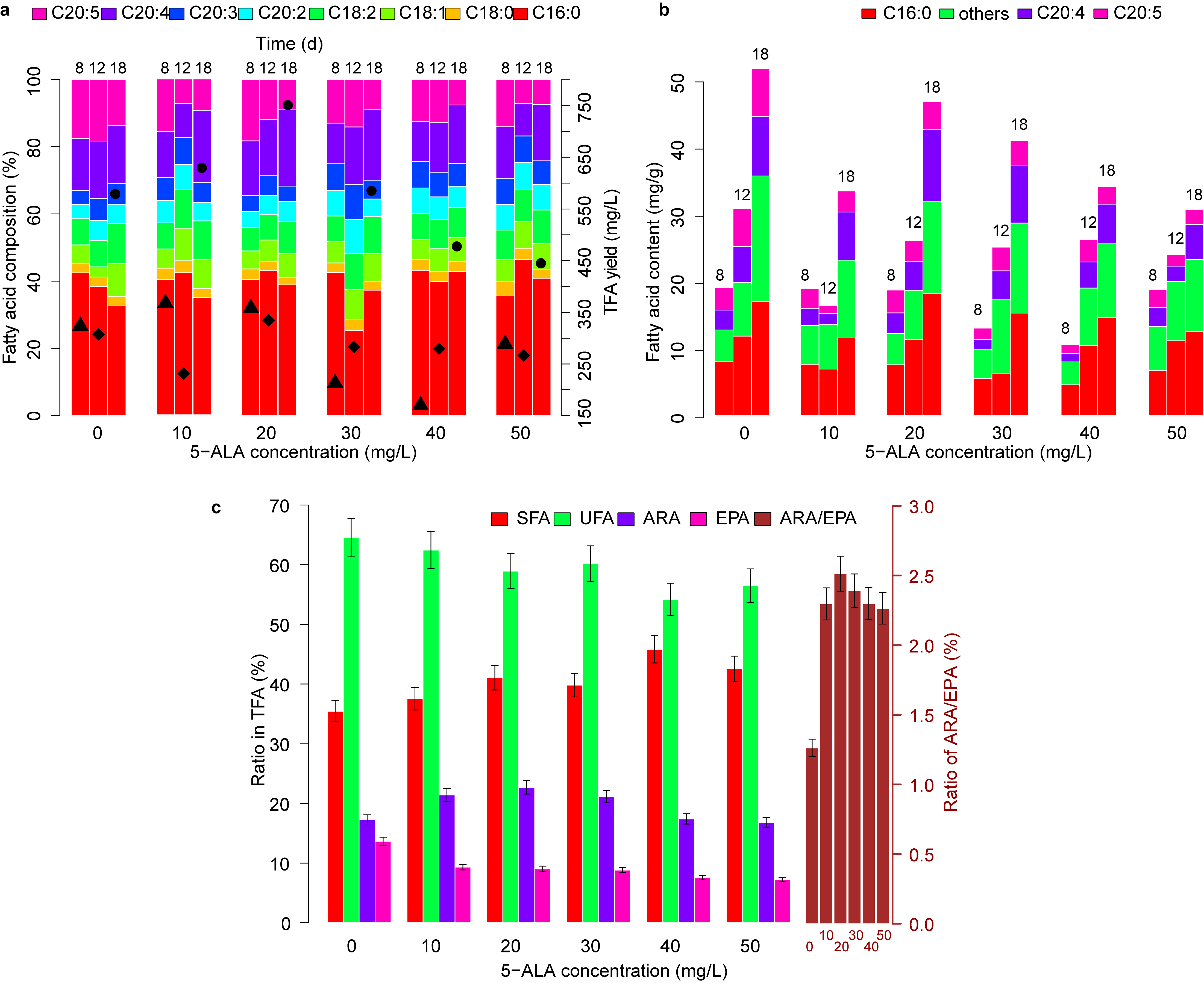 图1. 五氨基乙酰丙酸(5-ALA)促进紫球藻中花生四烯酸(ARA)的积累