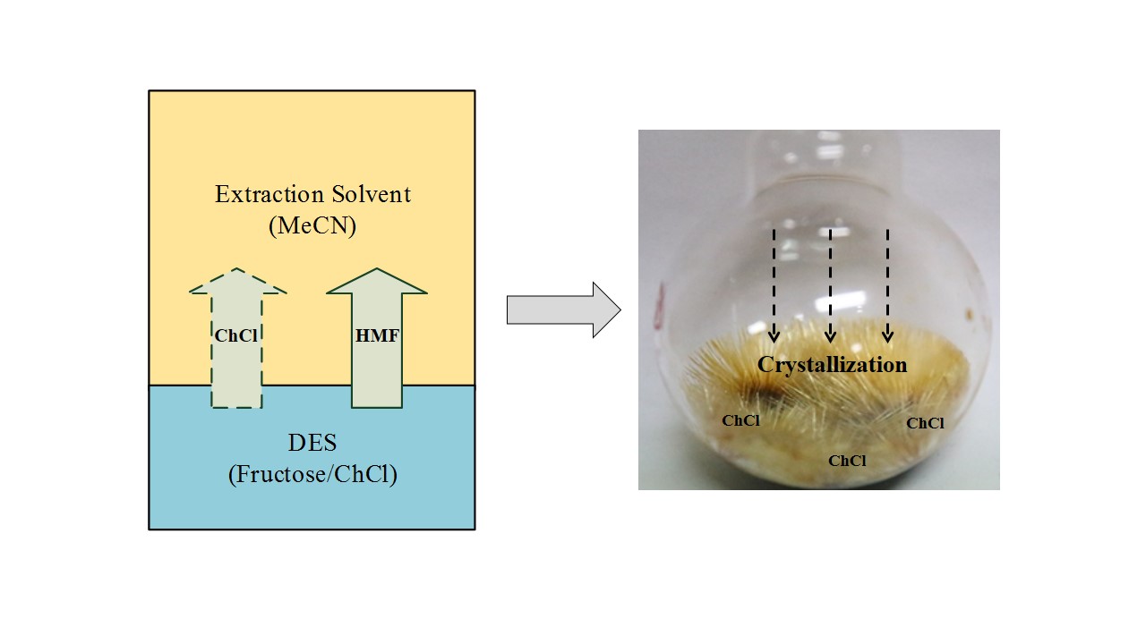 5-羟甲基糠醛(5-hydroxymethylfurfural,HMF)的高效清洁制备作为生物质催化转化领域的研究热点和难点,一直受到国内外学者的广泛关注。本研究以果糖和氯化胆碱组成新型低共熔反应体系(deep eutectic solvents,DESs),以相对便宜清洁的超低浓度无机酸(< 0.01m)作为催化剂,在较为温和的反应温度和高底物浓度条件下果糖转化hmf得率超过90%。特别重要的是,在乙腈与des组成两相溶剂系统中可以高纯度地分离hmf和实现氯化胆碱的循环利用,回收的氯化胆碱在循环使用五次后hmf的产率仍然接近90%。本论文研究在新型、清洁、可再生的反应溶剂体系中制备和分离hmf,并对hmf的后续应用和转化有积极的促进意义。