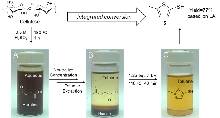 课题组博士生李铮作为第一作者在Green Chemistry发表了题为“Tandem thionation of biomass derived levulinic acid with Lawesson Reagent”研究论文。该项研究首次报道了以生物基乙酰丙酸为原料,在劳森试剂(Lawesson reagent, LR) 作用下经过多步连续的硫化反应合成噻吩类化合物,单一噻吩产物的最高得率可达78%。这一研究进一步拓宽了生物基乙酰丙酸作为平台分子的应用领域。