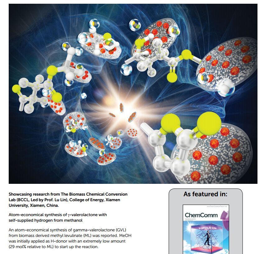 课题组博士生李铮在Chemical Communications(IF 6.834)发表了题为“Atom-economical synthesis of γ-valerolactone with self-supplied hydrogen from methanol”的后封面文章(back cover)。李铮同学开发了一种原子经济的合成新型生物质基平台分子γ-戊内酯的催化工艺:以乙酰丙酸甲酯在Cu-Cr催化剂作用下加氢环化过程中脱去的甲醇作为原位氢源合成γ-戊内酯。该催化工艺对氢供体(甲醇)投入量要求非常低,且不需要使用外界的氢气和贵金属催化剂,但其催化效率非常高,是一种非常经济的合成γ-戊内酯的新工艺。